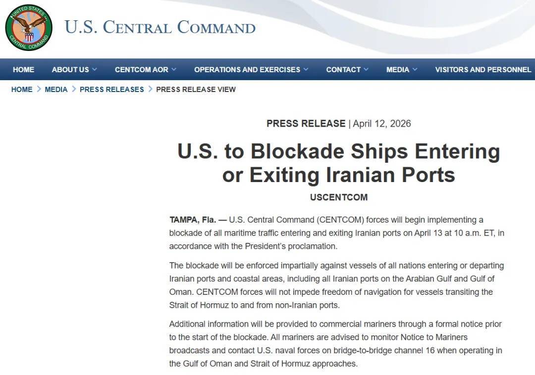 好意思军中央司令部暗示,将凭据总统敕令于好意思国东部技巧13日10时初始对统统收支伊朗口岸的海上交通实施阻塞。