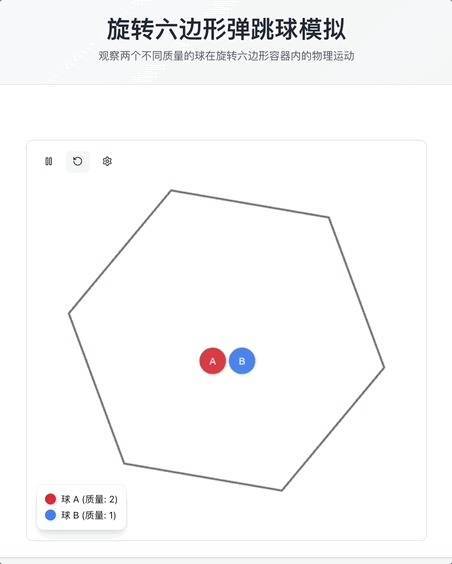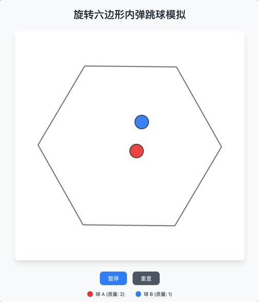 输入:模拟一个旋转六边形内弹跳球,有两个球体积接洽,球a的质地是球b的2倍。