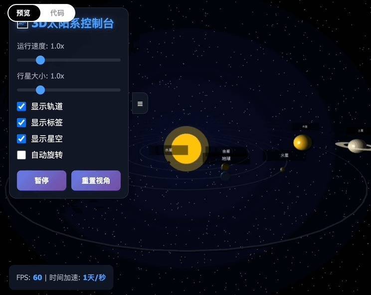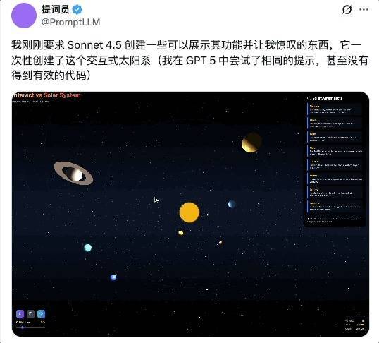 GLM-4.6与本日最新发布Claude Sonnet 4.5比较如何呢?如下图所示,这是X平台用户“教唆词”展示的一个让他“咋舌”的例子——一次性创建交互式太阳系。这位用户称,在GPT-5尝试接洽的教唆莫得获得灵验代码,GLM-4.6是否能胜任?