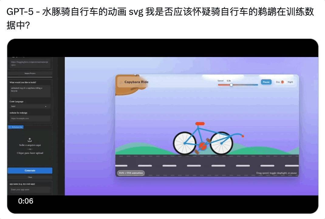 GLM-4.6在SVG动画生成的例题中,也杀青了高出GPT-5的和会和编程才气。如下图所示,一位X平台用户用GPT-5去生成“水豚骑自行车”的SVG动画,然则动画中却莫得准确生成出水豚,令这位用户怀疑:GPT-5好像只会生成教育数据中出现过的内容,梗概因为水豚没出现过是以不可生成。