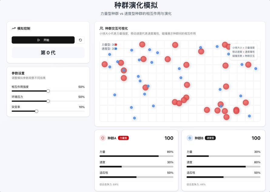如下图所示,GLM-4.6完成了一步杀青,不仅模拟出速率型种群快速被力量型种群脱色的物理执法,还通过模块化的戒指板,给出了模拟戒指、参数开辟、种群A和B的动态想象等发展情况,前打量觉后果仍是相配好意思不雅,不错说“表里兼修”。