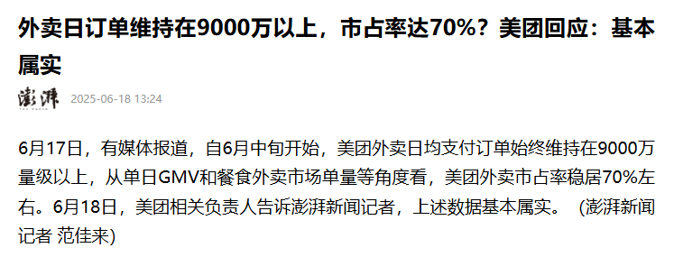 自6月中旬运转,好意思团外卖日均支付订单持久守护在9000万量级以上,从单日GMV和餐食外卖市集单量等角度看,好意思团外卖市占率稳居70%傍边。