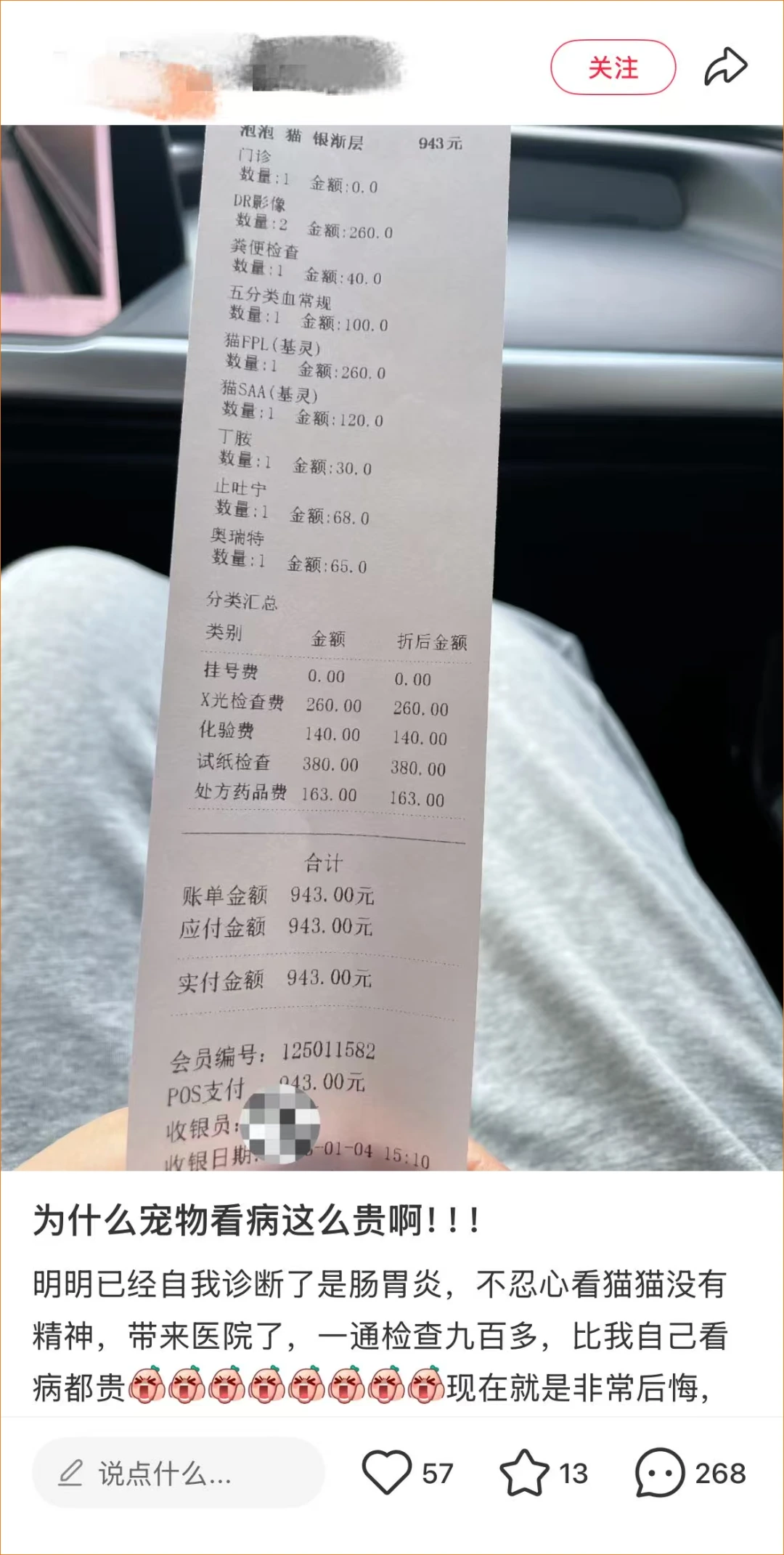 在某红书上,吐槽宠物看病贵的帖子险些满地王人是,“东说念主伤风300,狗伤风3000”“1500买的小猫,治病又花了5000多”,把柄2023年的数据,宠物手术的消耗平均就在5000元独揽,铲屎官压力山大。