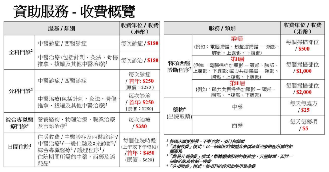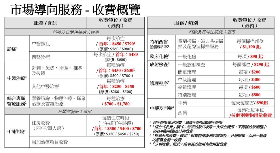 在资助办事下,全科门诊的中医门诊、西医门诊、中医调理每次收费各180港元。分科门诊设首年体验价,中医诊症、西医诊症、中医调理每次250港元。至于轮廓专职医疗门诊,每次调理收费380港元。白天入院办事方面,首年价钱为每个入院时段450港元。